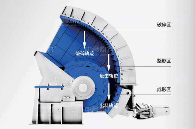錘破制砂機內部從上到下分別是物料的破碎區、整型區、成型區,其中破碎區的襯板花紋設計為波浪下行式,對物料起到整形作用,中間的整型區反擊板采用了菱形花紋設計,物料的運動軌跡在錘頭下方,有利于減少物料在機腔內重復破碎;