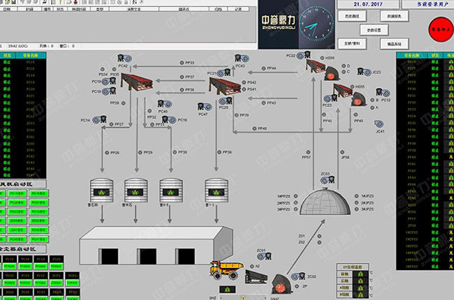 通過中控系統(tǒng)可以實現(xiàn)礦山設備的一鍵開關及單獨控制,通過傳感器等自動采集設備運行狀體及工作情況,如軸承溫度、設備工作電流、電壓、速度等狀態(tài)監(jiān)測,對電量、產量統(tǒng)計。實現(xiàn)各級設備及各環(huán)節(jié)的集中控制及管控。