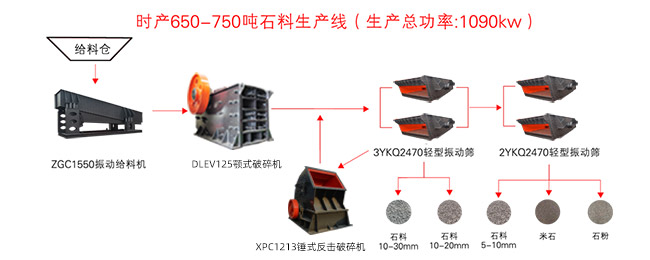 以常見的時(shí)產(chǎn)700左右顎式破碎機(jī)石料生產(chǎn)線配置舉例,工藝流程如上圖所示,大塊物料經(jīng)料倉(cāng)連續(xù)、均勻的輸送到DLEV125顎式破碎機(jī)中進(jìn)行初級(jí)破碎,破碎后的一部分物料直接進(jìn)入篩分環(huán)節(jié),一部分物料輸送到XPC1213錘式反擊破碎機(jī)中細(xì)碎整形,而后進(jìn)入篩分環(huán)節(jié),篩分出來不符合成品料粒度要求的被返料帶返回二級(jí)破碎機(jī)再次加工,形成一個(gè)閉路循環(huán),設(shè)備配置可以根據(jù)項(xiàng)目實(shí)際需求靈活配置。