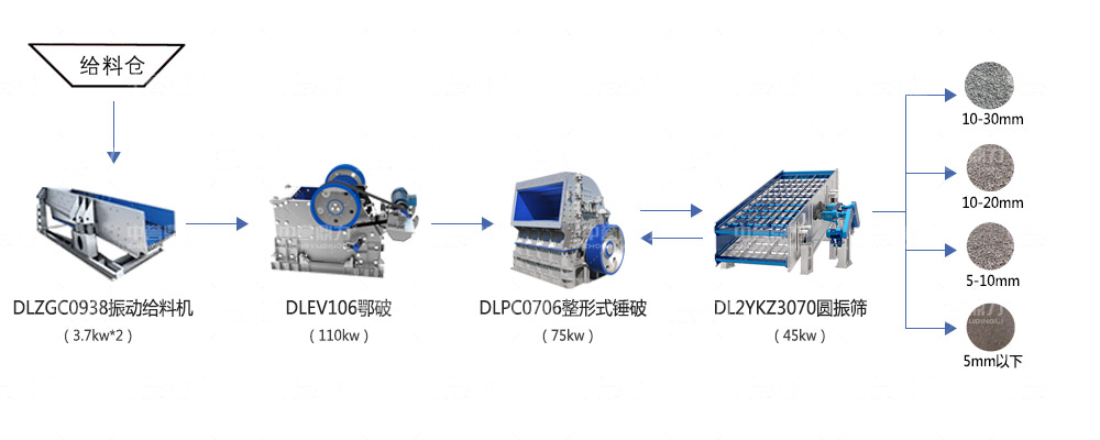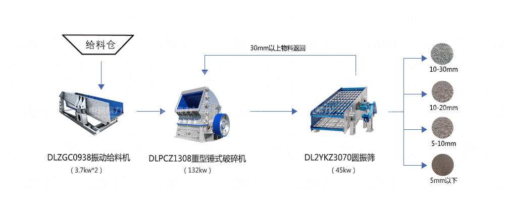 中低硬度物料主機可以選擇錘式破碎機,一次成型,集破碎和整形于一體,初級破碎出一部分成品料,大于30mm以上的物料被返料返送至錘式破碎機中再次破碎,振動篩篩網層級和篩孔尺寸可以根據客戶對成品料需求進行增減和定制。