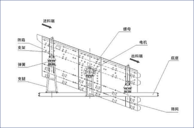 上圖為yah2460型圓振動篩結(jié)構(gòu)圖和工作示意圖,從結(jié)構(gòu)圖可以看到,該設(shè)備由箱體、支架、支腿、電機、底座、篩網(wǎng)、支腿等部分組成,篩面安裝傾角建議在20度,傾角過大物料篩分不干凈,傾角過小篩分效率過低,建議在廠家安裝人員指導(dǎo)下合理選擇。篩孔大小也可以根據(jù)要處理物料大小進(jìn)行定制。