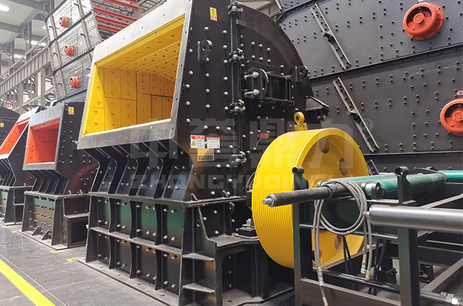左側圖片就是反擊式粉碎機的結構圖,該設備主要由機架、襯板、反擊襯板、反擊架、進料斗、電機、傳動裝置等組成,其中反擊板分為三組,形成兩個粉碎腔,在第一個粉碎腔可以把≤850mm的物料粉碎成100mm以下。在第二個粉碎腔中可以把100mm的物料在粉碎至20mm以下,平常需要兩臺設備來粉碎,這里只需要一臺反擊式粉碎機,過程簡化為一段破碎,另外設備整體結構緊湊、外形美觀。