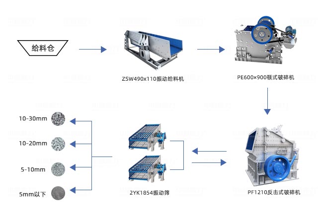 每小時200噸的石子生產需求,要考慮原料硬度、程度、成品需求等因素,在不同工藝配置方案下,生產的成品料不同、投入費用也不同,以下介紹幾種不同的工藝流程和破碎方案。