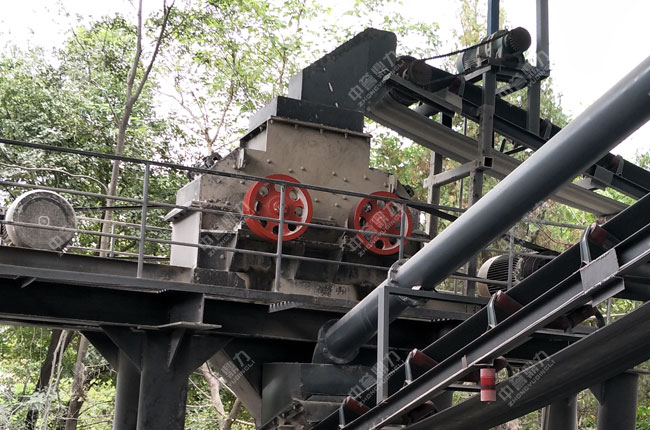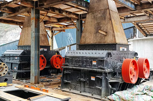 方案二:適合石灰石、青石、煤矸石等中低硬度或者脆性物料的制砂作業,重錘破可將大塊物料直接破碎到30mm以下用來制砂,設備投資成本低。