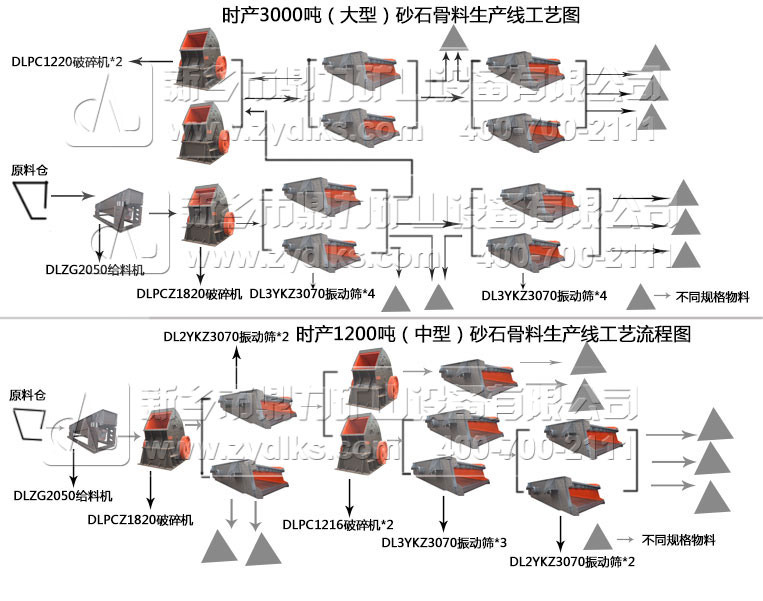 從上面流程圖和配置清單可以看出,不同產量的生產線可以通過不同產量設備的搭配使用來進行砂石生產線的配置。3000噸石料生產線與1200噸石料生產線使用相同型號的振動給料機,但是卻使用的是不同型號錘式破碎機,型號不同,產量也就不同。同時振動篩數量的增加也會提高生產線的產量。