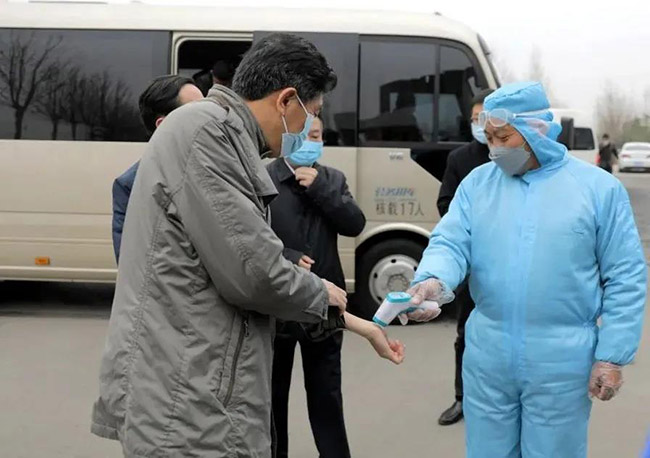 體溫檢測(cè)后進(jìn)入中譽(yù)鼎力智能裝備公司廠區(qū)