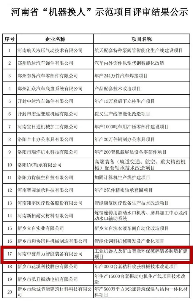 其中,河南中譽鼎力智能裝備有限公司工業機器人及礦山智能環保破碎裝備制造擴建項目成功通過評審。