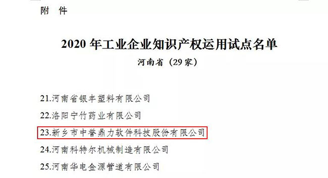 為深入實施家知識產權戰略,按照《制造業知識產權行動計劃(2018-2020年)》(工信部聯科【2018】239號)、《工業和信息化部辦公廳關于開展工業企業知識產權運用試點工作的通知》(工廳科【2020】725號)要求,經企業自愿申報、地方與行業、形式審核等程序,近期,工業和信息化部辦公廳公布了工業企業知識產權運用試點企業名單。新鄉市中譽鼎力軟件科技股份有限公司榜上有名!
