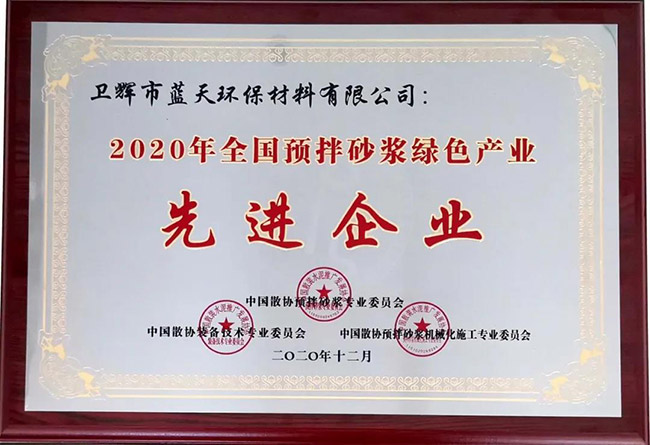 年度表彰環(huán)節(jié),衛(wèi)輝市藍(lán)天環(huán)保材料有限公司作為新鄉(xiāng)市5家成功入選企業(yè)之一,喜獲“2020年預(yù)拌砂漿綠色產(chǎn)業(yè)企業(yè)”榮譽(yù)表彰!