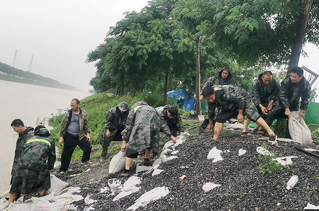 范工和大家一起“扎根”孟姜女河堤,嚴(yán)陣以待投入河道防汛救災(zāi)工作(下圖右一)。他們頂風(fēng)冒雨,不顧個人安危,搶裝防汛沙袋堵住壩口,一天一夜未眠,盡力守護河堤安。