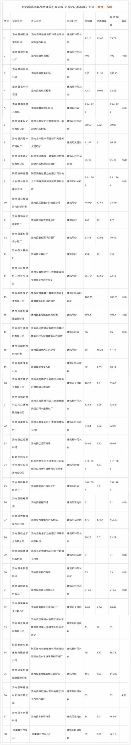2019年9月4日,陜西省商洛市洛南縣發(fā)布《關(guān)于洛南縣礦山儲量的公示》以下簡稱(《公示》),《公示》對陜西省洛南縣胡敏建筑石料場等38家砂石場儲量匯總。