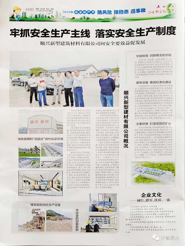 近日,中譽(yù)鼎力EPC承建的江西省景德鎮(zhèn)市順興建筑材料有限公司九英山采石場(chǎng)骨料生產(chǎn)項(xiàng)目因安生產(chǎn)工作突出,被當(dāng)?shù)孛襟w登報(bào)予以宣傳!