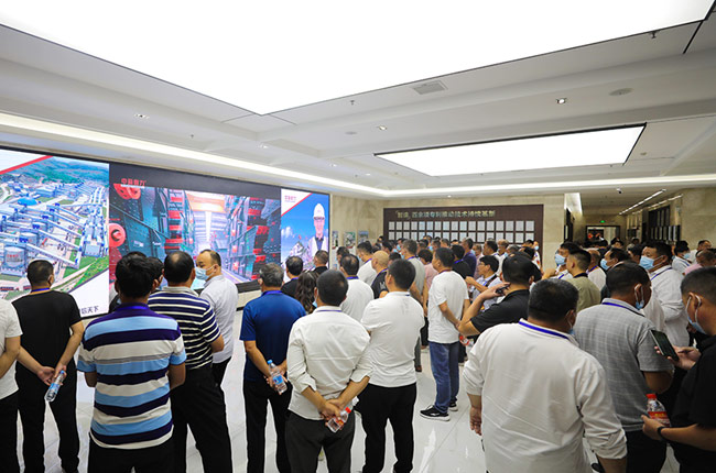 在智能裝備公司綜合辦公樓,考察團先后參觀了中譽鼎力企業文化墻和多位一體循環建材產業園項目沙盤,并觀看了公司相關宣傳片,對中譽鼎力主營業務及近年來發展情況有了進一步了解。