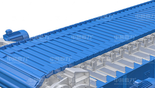 鏈條采用坦克鏈傳動,強度高,拉力大,設備使用壽命長。安裝時可直接與原料倉接觸,承重力強。