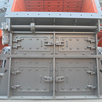由機殼、轉子、錘頭、支架、襯板等組成。電機帶動轉子在破碎腔內高速旋轉,物料自上部給料口給入機內,受高速運動的錘子的打擊、沖擊、研磨作用而破碎,傳統在破碎后,小于篦條空隙的物料通過篦條排出,我公司采用可調整節反擊襯板的方式出料,避免了因為物料不規則反復擊打,產粉量大的問題;一個人一把扳手即可調整出料粒度,免去了更新篦條的繁瑣;大塊物料主動避讓,避免了轉子損傷或堵料,同時,附加了反擊功能,出料粒型更。