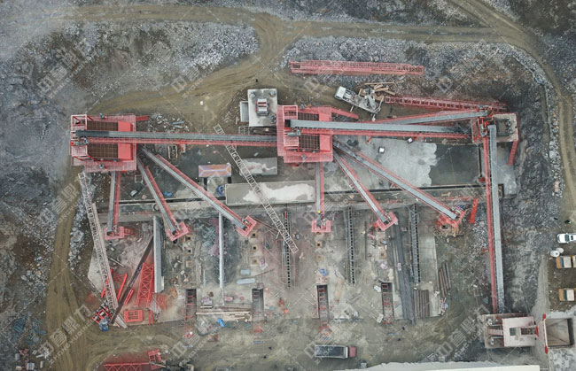 工藝流程:原料經(jīng)料倉(cāng)由ZG1550振動(dòng)給料機(jī)送到重型錘式破碎機(jī)PCZ1615進(jìn)行初步破碎,破碎后的物料被輸送到整形破XPC1622進(jìn)行加工,加工后的物料輸送到一組3YKZ3070并篩進(jìn)行篩分,篩分三種成品料,其中一部分被送到雙轉(zhuǎn)子制砂機(jī)ZSJ1218進(jìn)行細(xì)碎,不滿足成品料粒度要求的被返回整形破進(jìn)行再次加工,其余物料被送到下一組3YKZ3070并篩進(jìn)行篩分,篩分出三種成品料,分別送到成品料倉(cāng)中。