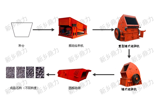 石子生產(chǎn)線主要分為給料、破碎、篩分三個(gè)環(huán)節(jié),其主要設(shè)備有振動(dòng)給料機(jī)、破碎機(jī)、整形機(jī)及振動(dòng)篩。大塊石頭從料倉(cāng)進(jìn)入給料機(jī)之后,物料再由振動(dòng)給料機(jī)均勻的喂入破碎機(jī)之后進(jìn)行破碎,破碎之后的物料通過皮帶輸送機(jī)進(jìn)入整形機(jī)內(nèi)進(jìn)行整形,后進(jìn)行篩分,直到篩出符合要求的成品料即可,不符合要求的需要再次進(jìn)入破碎機(jī)重新破碎。詳細(xì)的流程和設(shè)備可以參考下圖:
