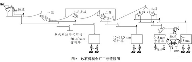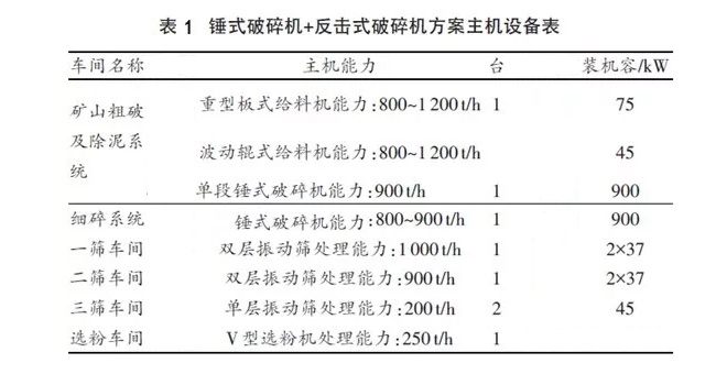 利用自有石灰石礦用配套投建砂石生產線采取的重錘式破碎機+整形錘式破碎機的主機設備見表1,廠工藝流程見圖2。