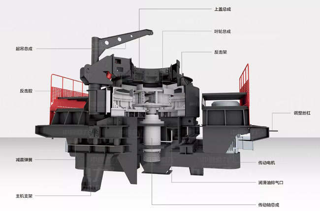 河南中譽鼎力制造的沖擊破制砂機組成部分包括起吊總成、反擊強、減震彈簧、主機支架、傳動軸總成、潤滑油排氣孔、傳動電機、調整絲杠、反擊架、葉輪總成、上蓋總成等組成。