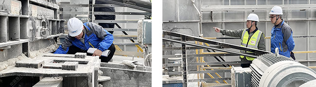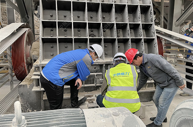 隨后,我們來到時產800到1000噸碎石生產線現場對設備進行實地查看。每一顆螺絲、每一個彈簧、每一處設備間隙、每一塊襯板、每一個配件的尺寸、垂直度,售后服務人員都檢查得格外仔細。