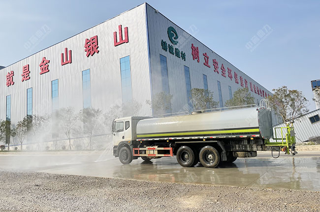 這條年產200萬噸環保智能砂石骨料生產線從破碎、輸送、篩分、儲存,各環節均采用封閉式結構,收塵管道布置于系統各處揚塵點,避免粉塵外溢,實現環保生產。此外,灑水車也在進行不間斷灑水,將環保措施落實到位。