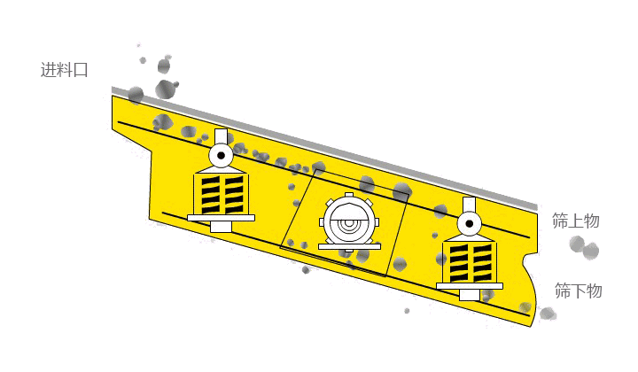 利用振動電機激振作為振動源,使物料在篩網上被拋起,同時向前作直線運動,物料從給料機均勻地進入篩分機的進料口,通過多層篩網產生數種規格的篩上物、篩下物,分別從各自的出口排出。